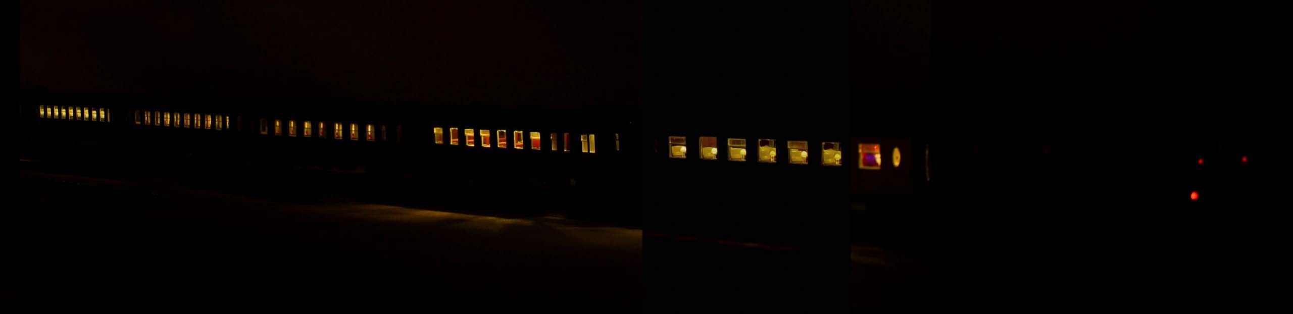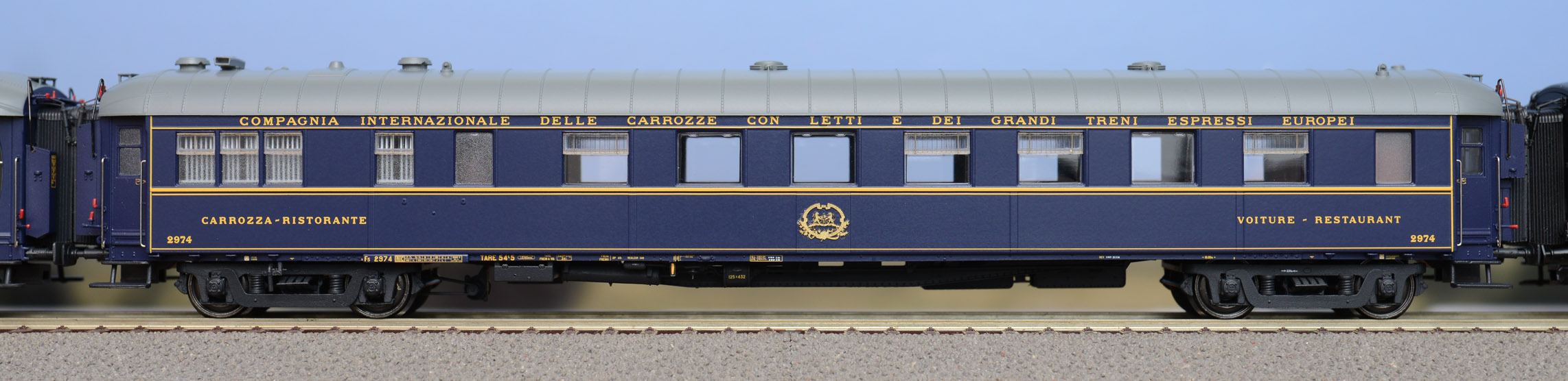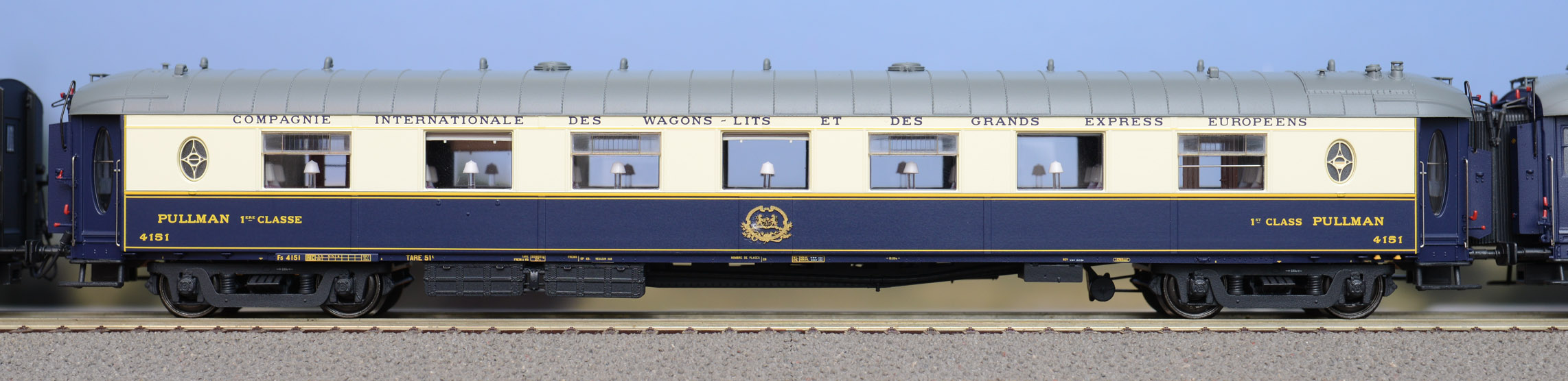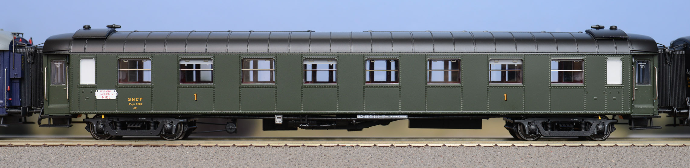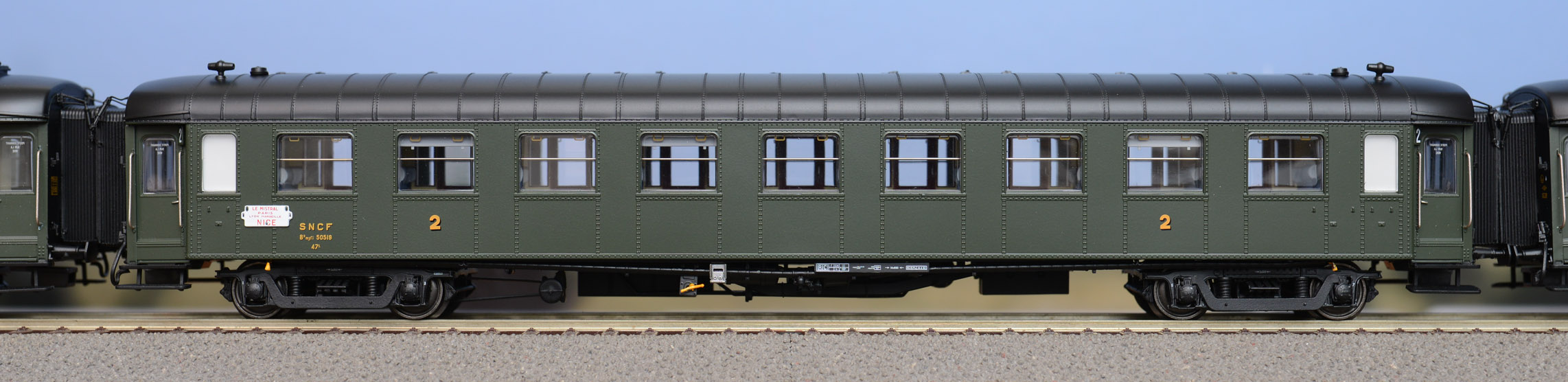 B9myfi 50536, ex P.L.M., marquage 1950, avec éclairage B9myfi 50519, ex P.L.M., marquage 1950, avec éclairage A8myfi 5260, ex P.L.M., marquage 1950, avec éclairage Restaurant CIWL 56pl. Reggio, 2974, avec éclairage Pullman CIWL 28pl., 4151, avec éclairage Dqd2m 59869, marquage 1950, avec feux de fin de convoi |